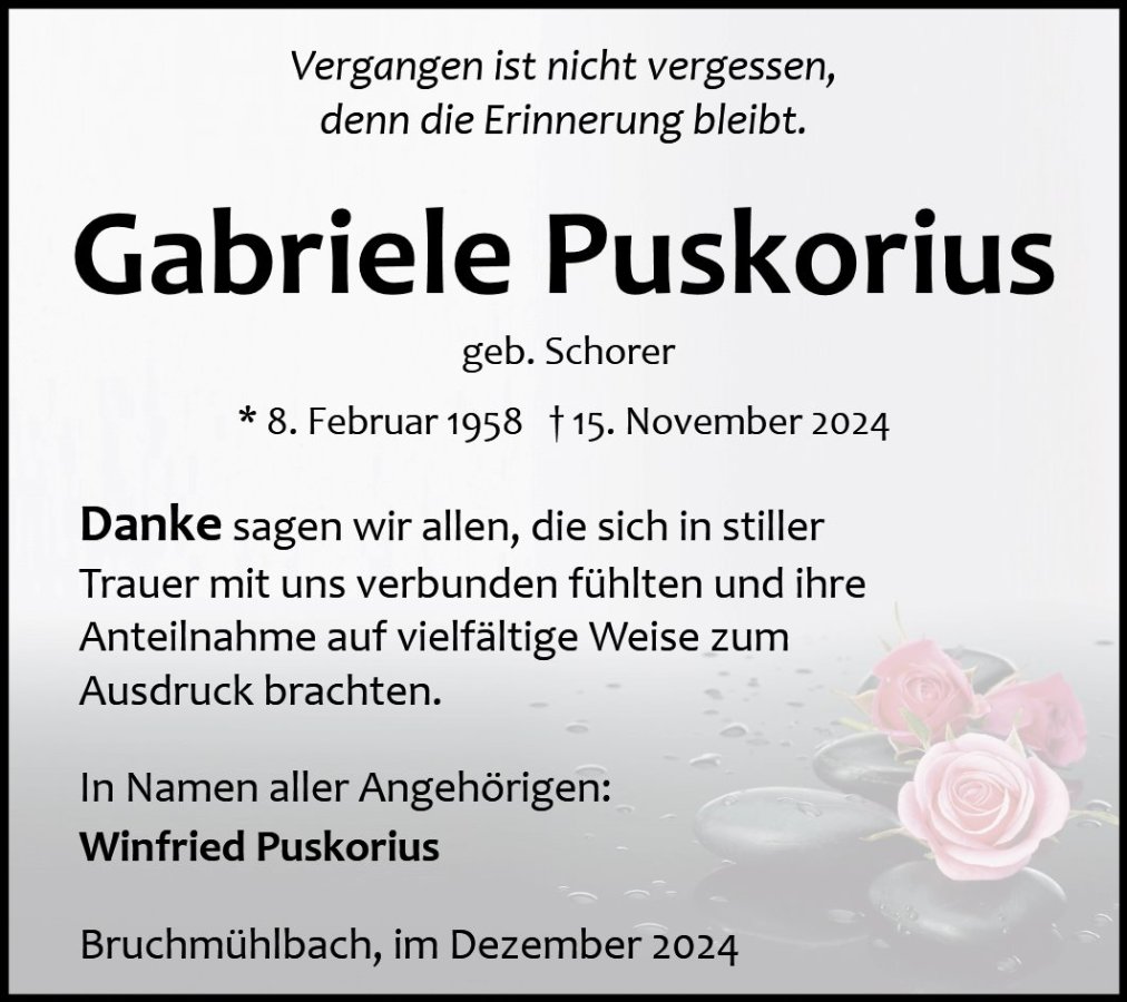 We are so sorry for the loss of Mrs. Gabriele and pray to God that He will give Mister Puskorius, and the Puskorius family, peace of mind and of heart.