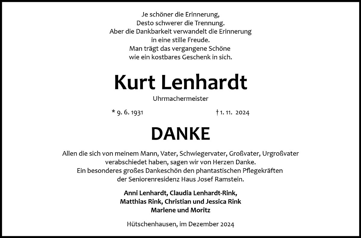Mit Herrn Kurt Lehnhardt verlieren wir einen Menschen, zu dem man in vielen Lebenslagen aufschauen konnte.