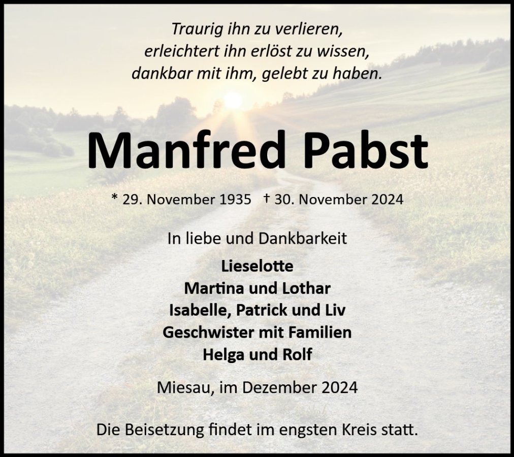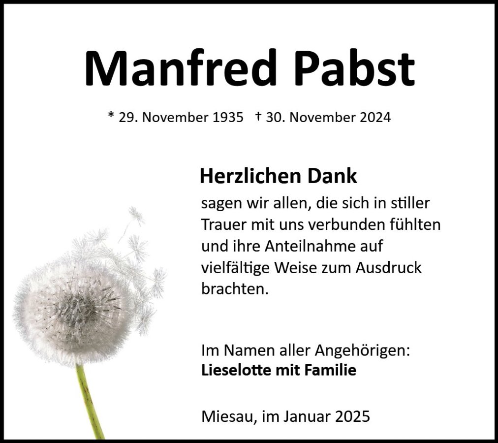 auf diesem Wege möchte ich Ihnen mein aufrichtiges Beileid zum Tod von Manfred Pabst aussprechen.